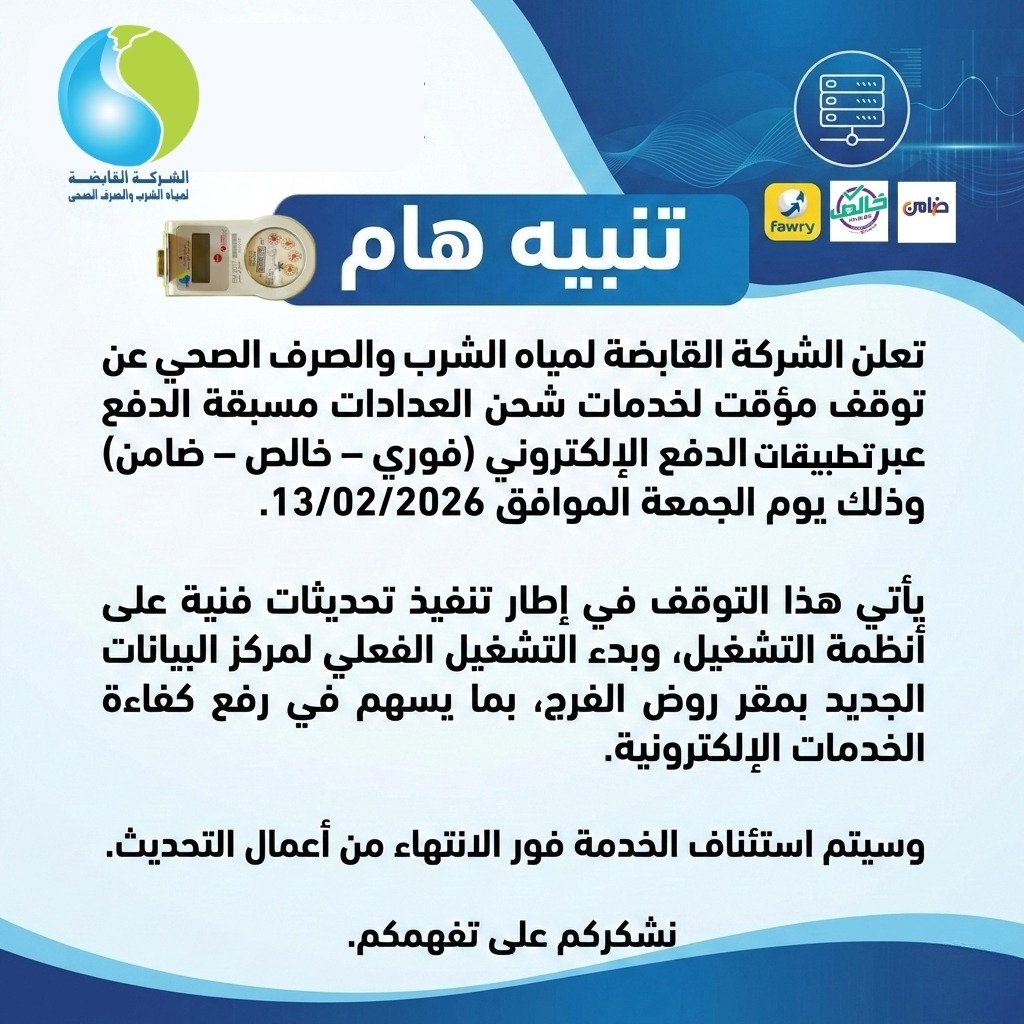 إنّ الحفاظ على كل نقطة مياه هي مسؤولية وطنية، ومن هذا المنطلق، تعمل الشركة القابضة لمياه الشرب والصرف الصحي وشركاتها التابعة على تقديم خدمات آمنة للمواطنين، من خلال تحسين الكفاءة التشغيلية والفنية، الاستثمار في العنصر البشري، والتوسع في تطبيق نظم التحول الرقمي، لضمان إدارة رشيدة للموارد وتحقيق الاستدامة للأجيال القادمة.