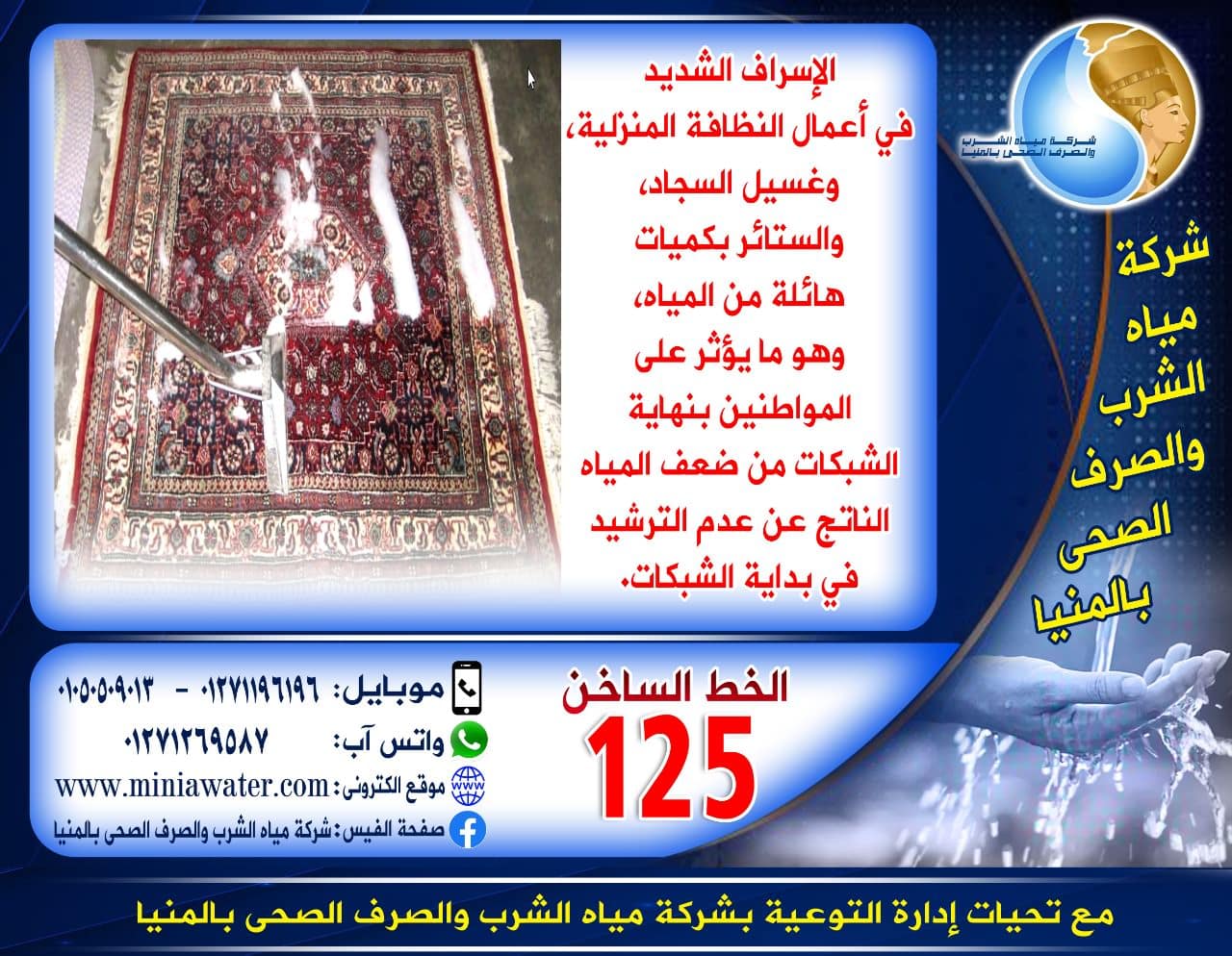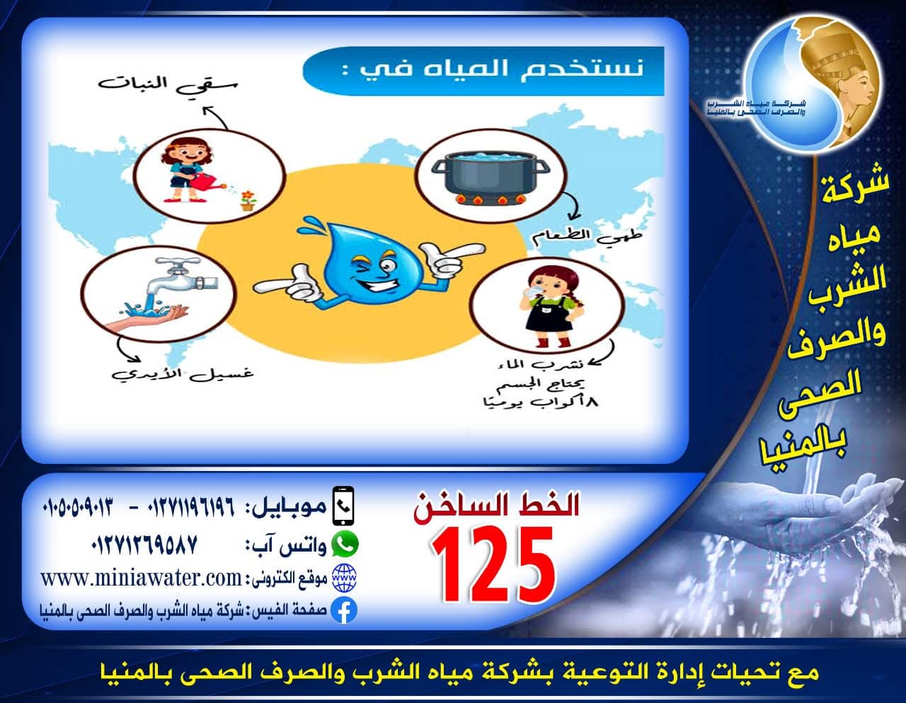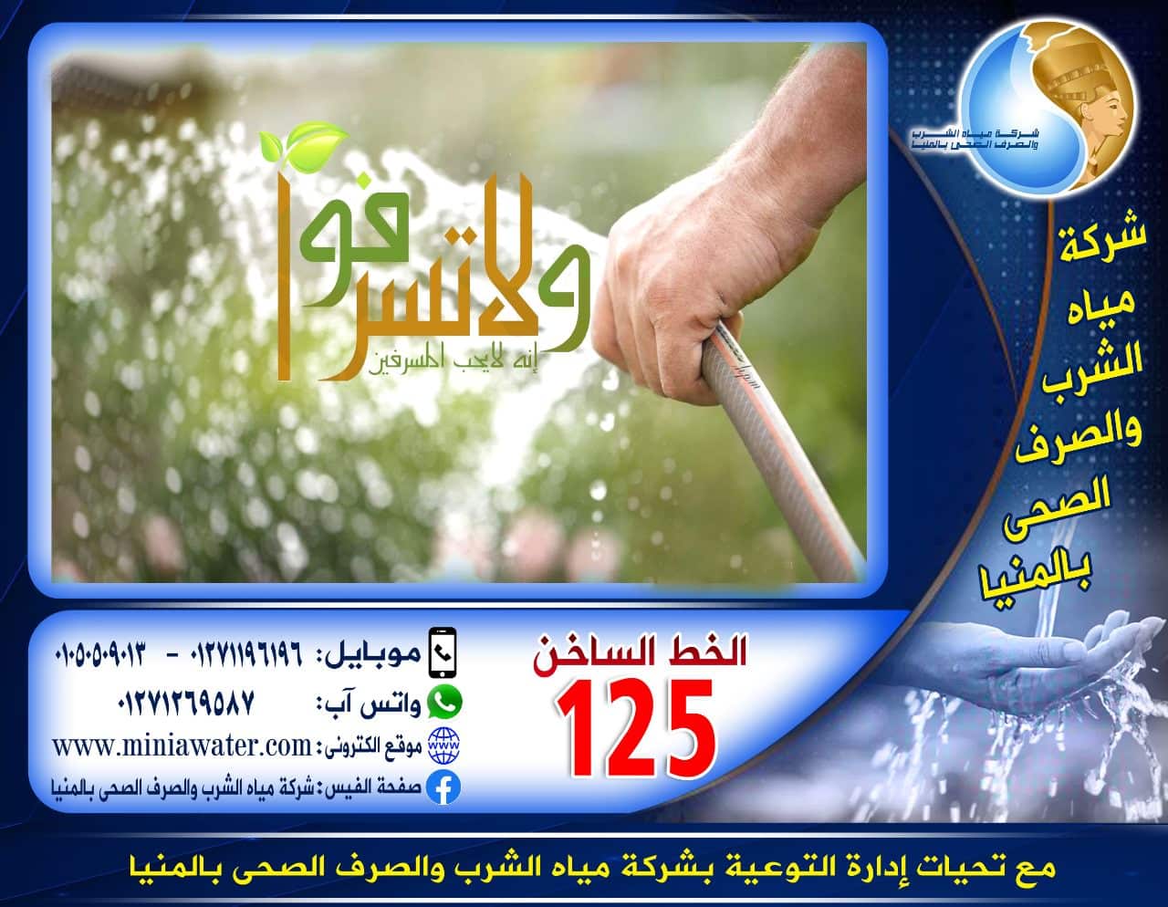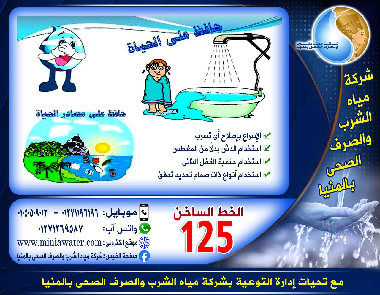أطلقت شركة مياه الشرب والصرف الصحى بالمنيا، حملة للتوعية المائية عن ترشيد استهلاك المياه وعدم الإسراف فى استخدامها تزامنا مع قرب حلول عيد الفطر المبارك، لتوضح الممارسات المثلى التى يجب اتباعها فى العادات المقترنة بالأعياد، كغسيل السجاد والتى تستهلك كميات كبيرة من المياه، وشملت الحملة كيفية الحفاظ على شبكات الصرف الصحى.