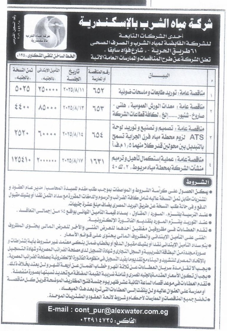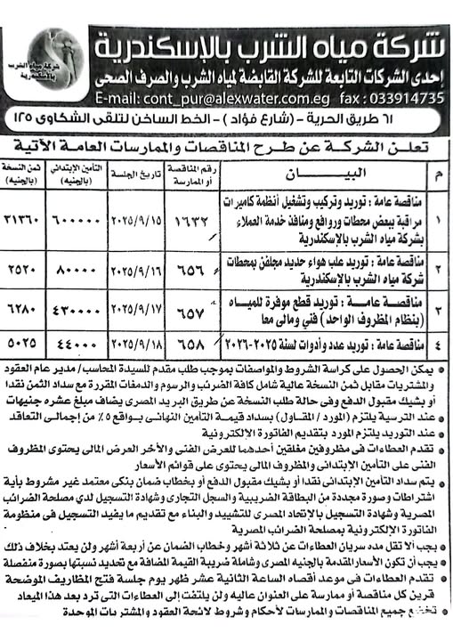مناقصة عامة: شركة مياه الشرب بالإسكندرية