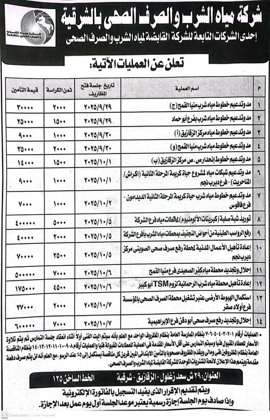 مناقصة عامة: شركة مياه الشرب والصرف الصحى بالشرقية