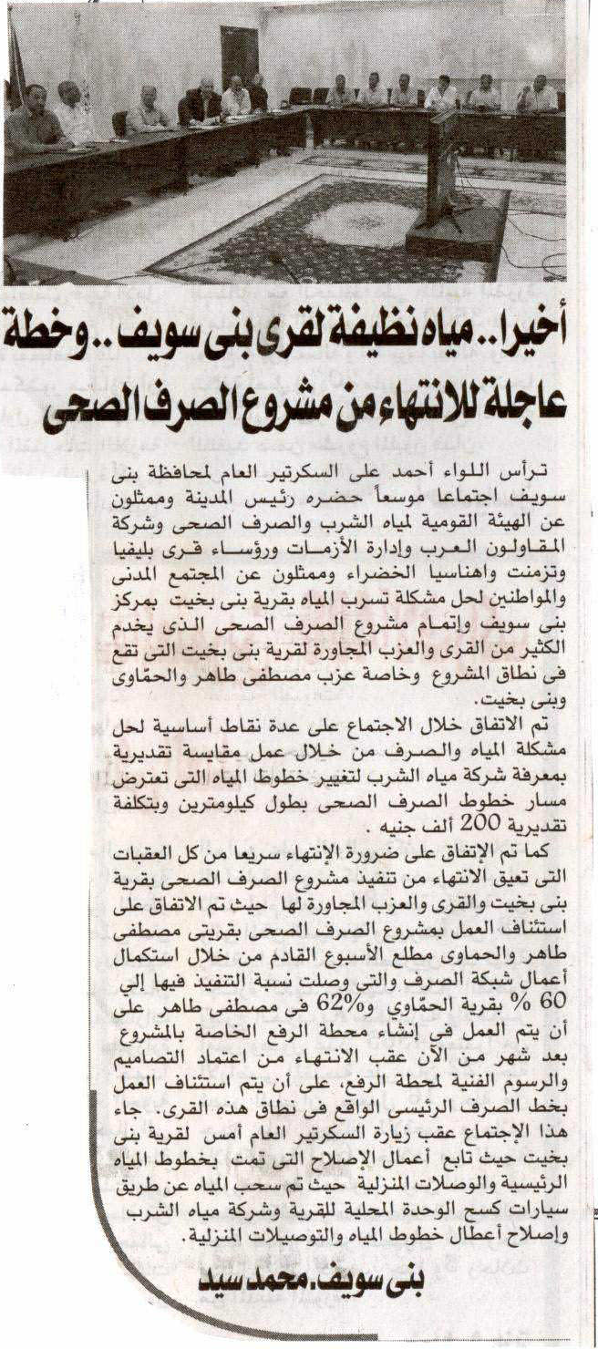 أخيراً.. مياه نظيفة لقرى بنى سويف .. وخطة عاجلة للانتهاء من مشروع الصرف الصحى