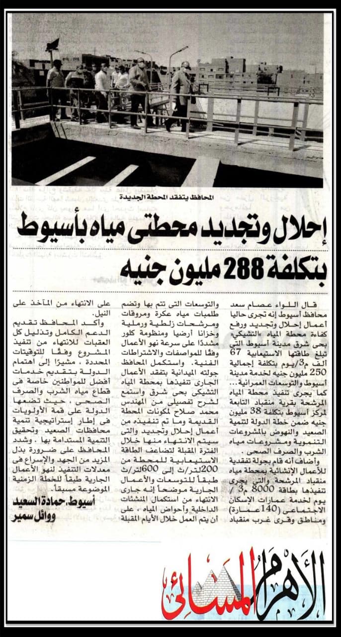إحلال وتجديد محطتي مياه بأسيوط بتكلفة 288 مليون جنية .