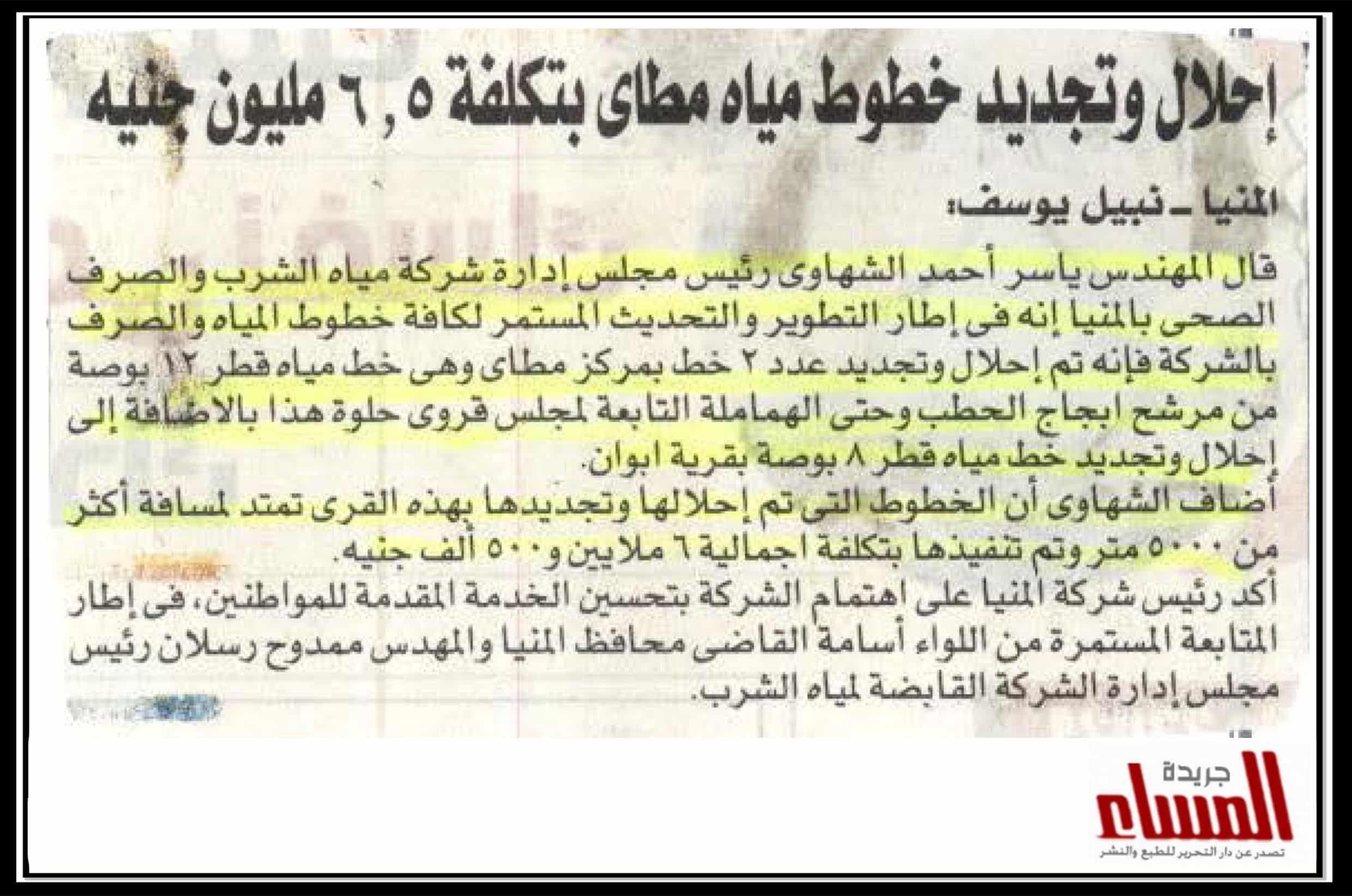 احلال وتجديد خطوط مياه مطاي بتكلفة 6.5 مليون جنية .