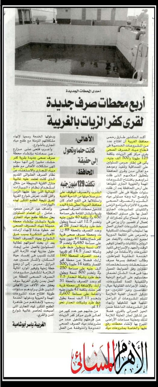 اربع محطات صرف صحي جديدة لقرى كفر الزيات بالغربية .