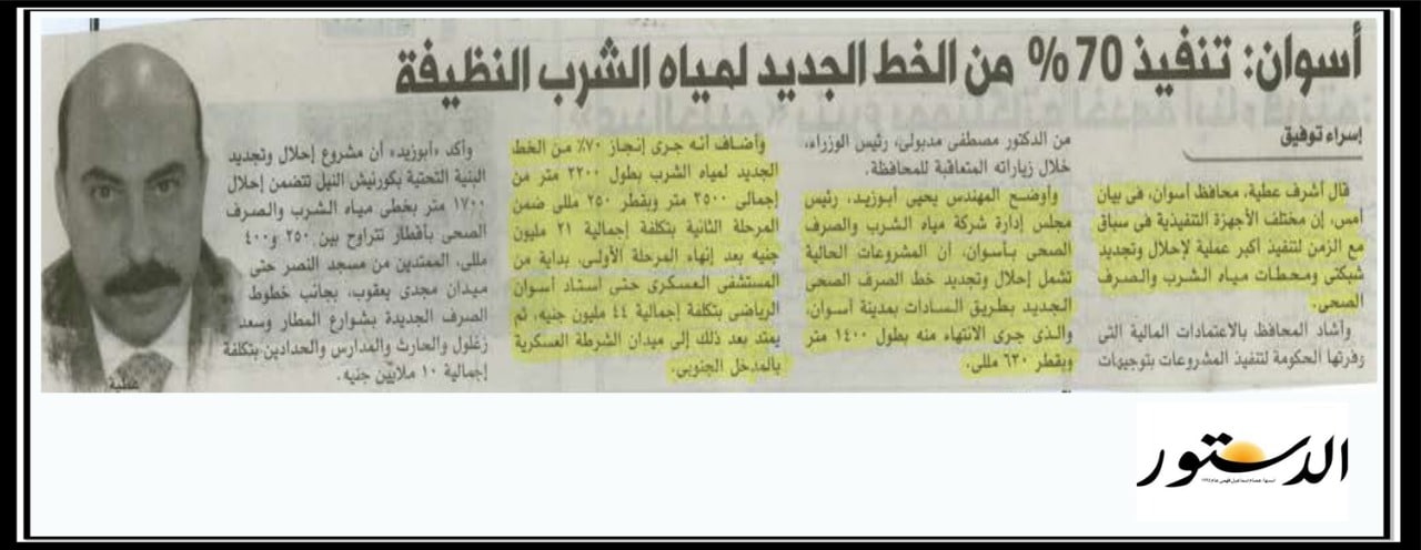 اسوان: تنفيذ 70% من الخط الجديد لمياه الشرب النظيفة