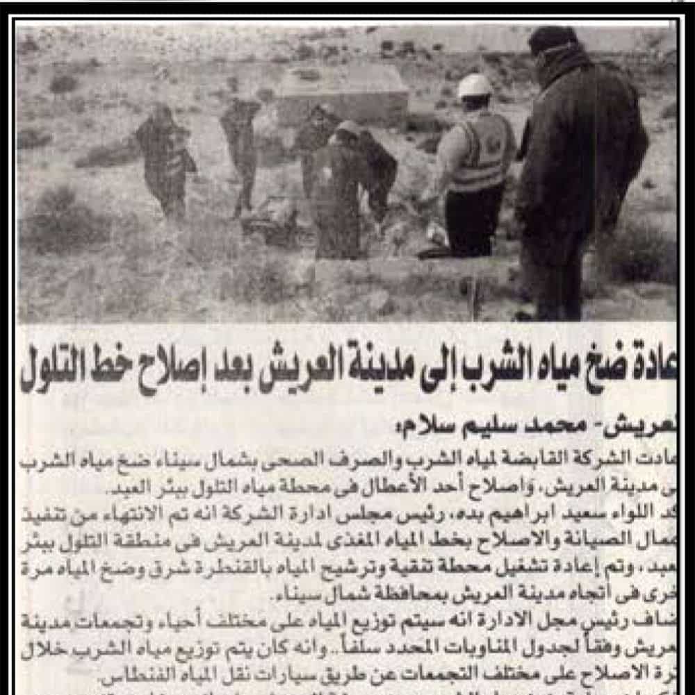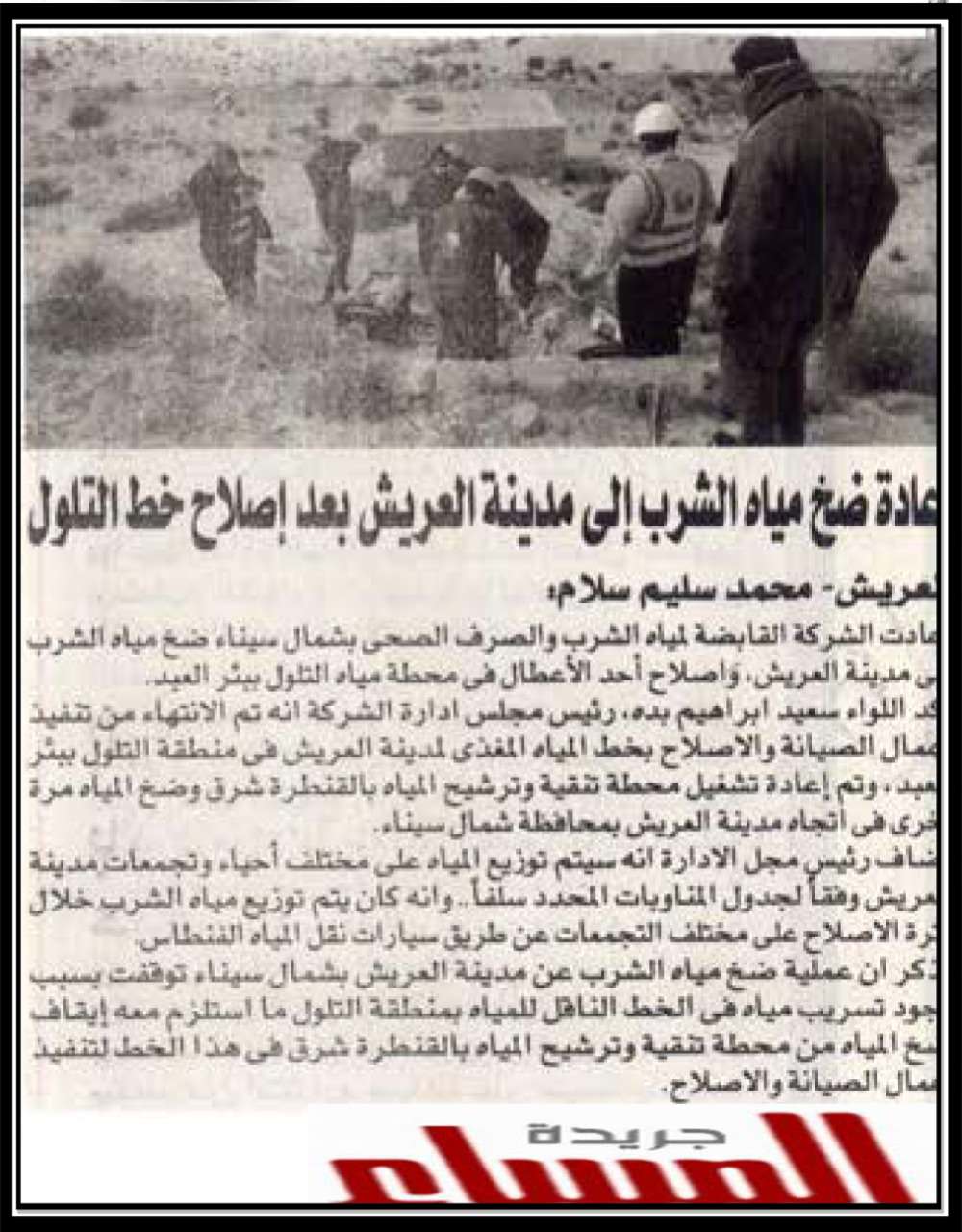 اعادة ضخ مياه الشرب إلي مدينة العريش بعد اصلاح خط التلول .