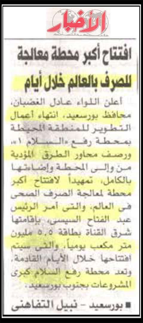 افتتاح اكبر محطة معالجة للصرف بالعالم خلال ايام