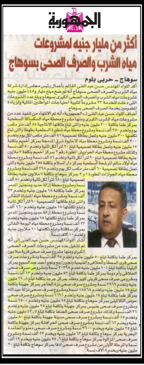 اكثر من مليار جنية لمشروعات مياه الشرب والصرف الصحي بسوهاج