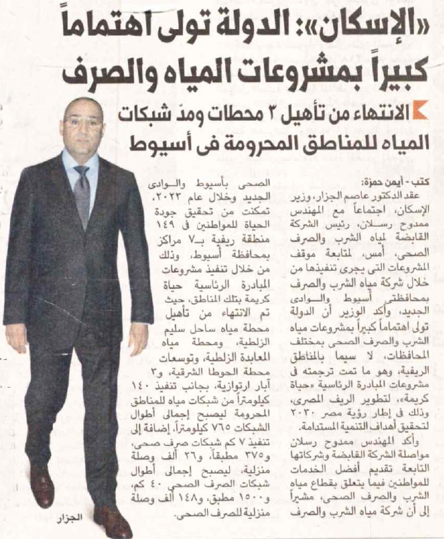 الإسكان : الدولة تولي اهتماماً كبيراً بمشروعات المياه والصرف .. الإنتهاء من تأهيل 3 محطات ومد شكبات المياه للمناطق المحرومة في أسيوط.