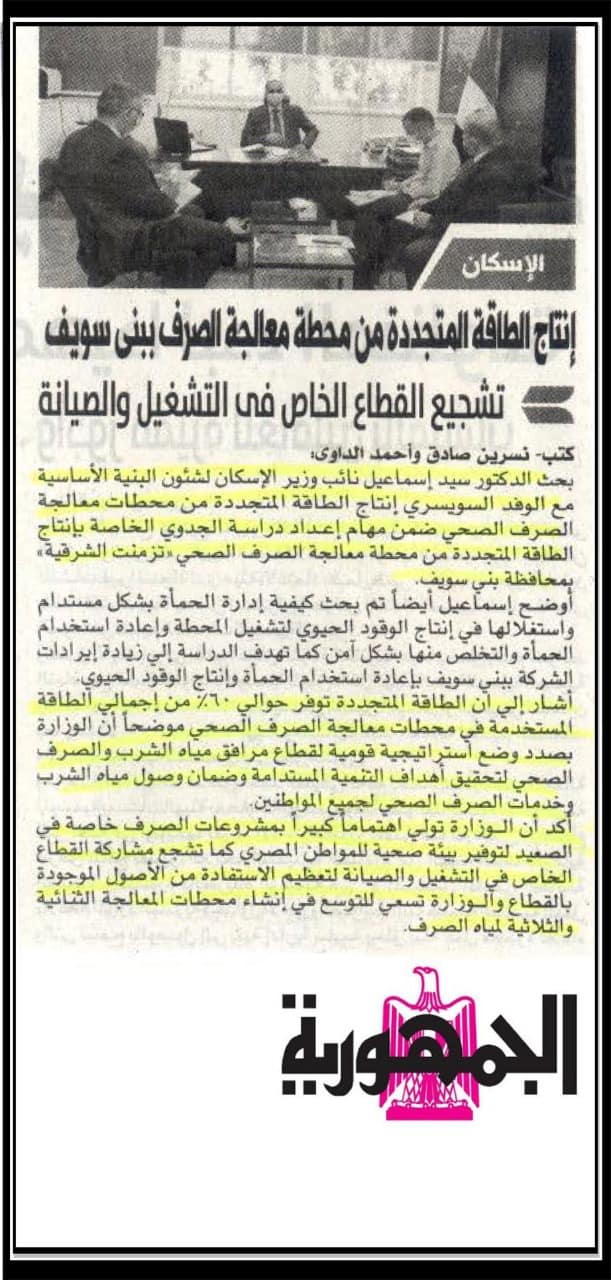 الاسكان : إنتاج الطاقة المتجددة من محطة معالجة الصرف الصحي ببني سويف .