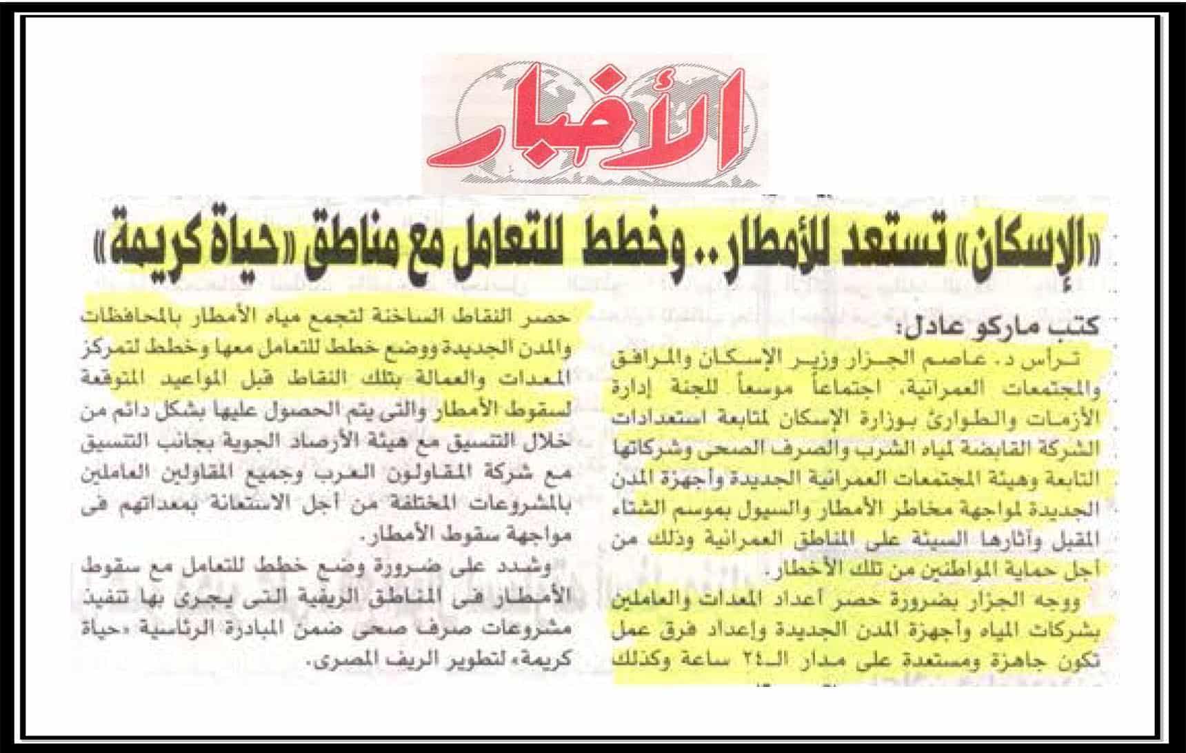 الاسكان تستعد للامطار وخطط للتعامل مع مناطق حياة كريمة
