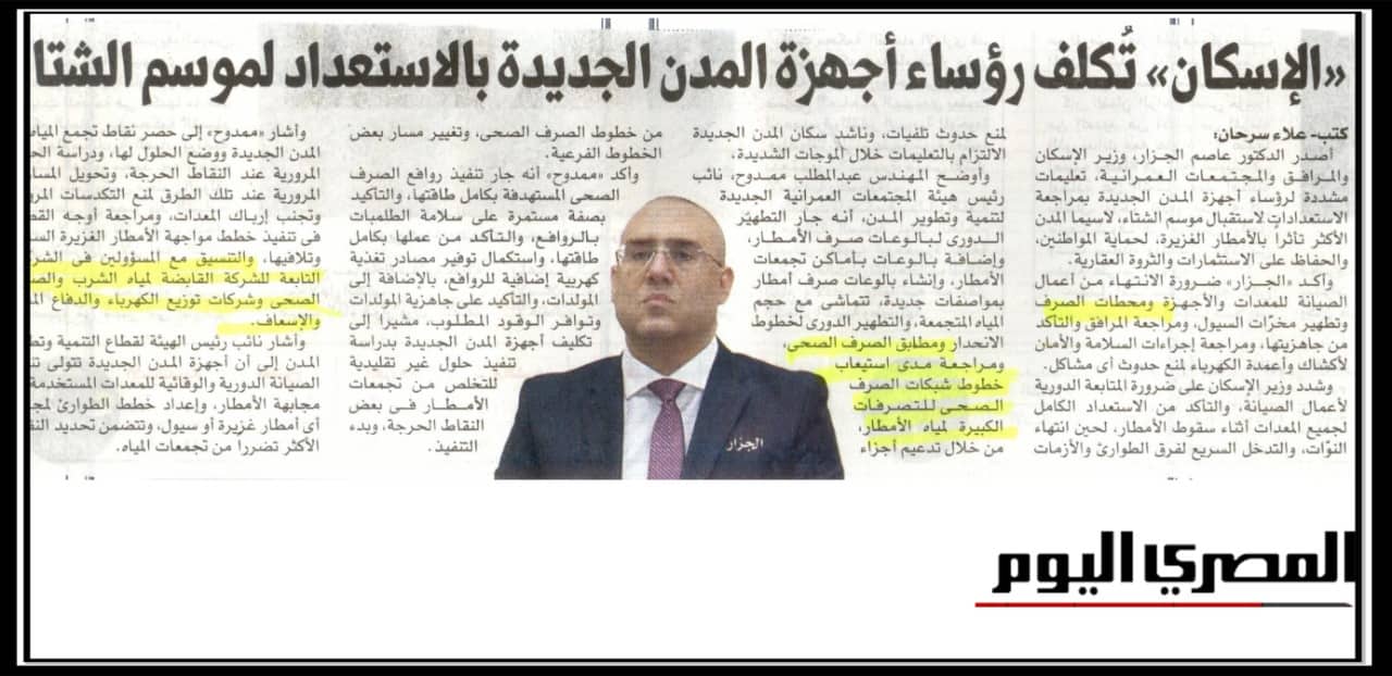 الاسكان: تكلف رؤساء أجهزة المدن الجديدة بالاستعداد لموسم الشتاء .