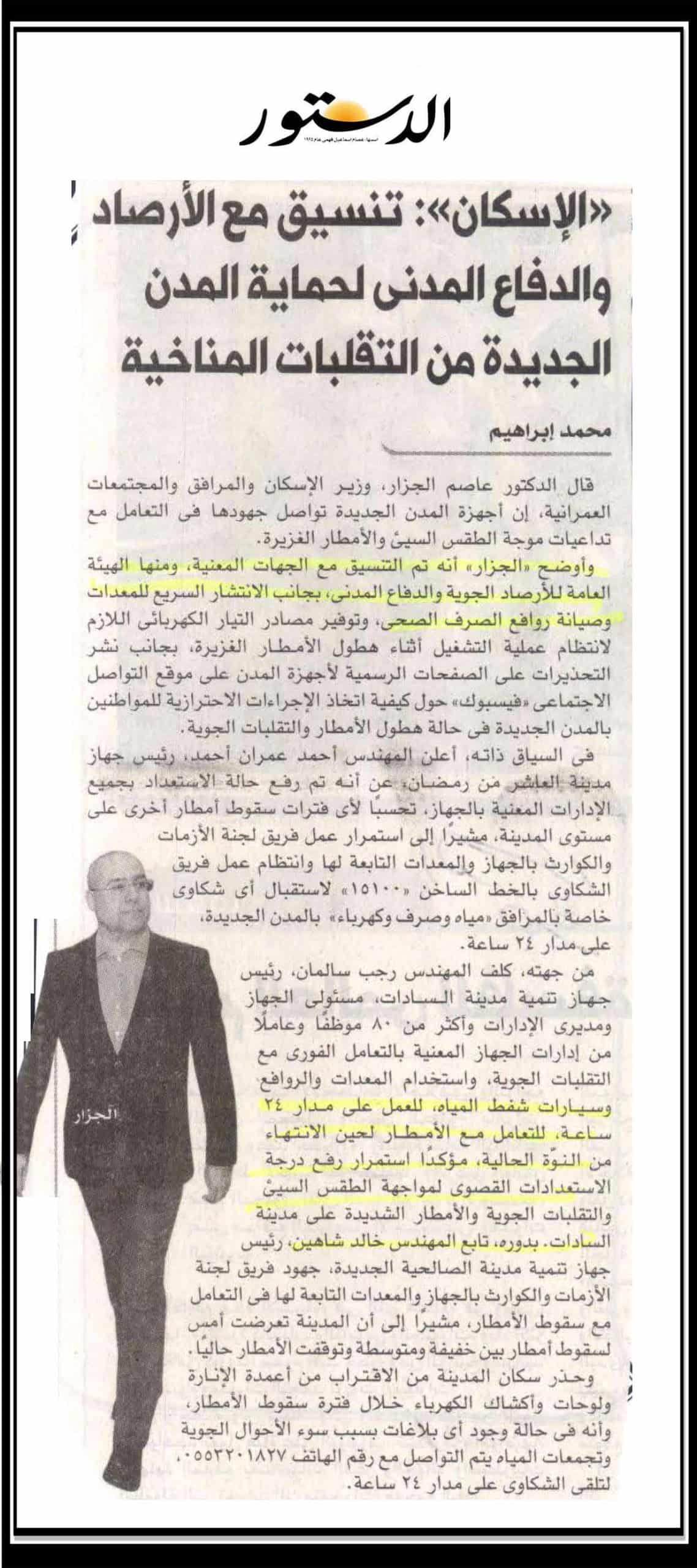 الاسكان: تنسيق مع الارصاد والدفاع المدني لحماية المدن الجديدة من التقلبات المناخية
