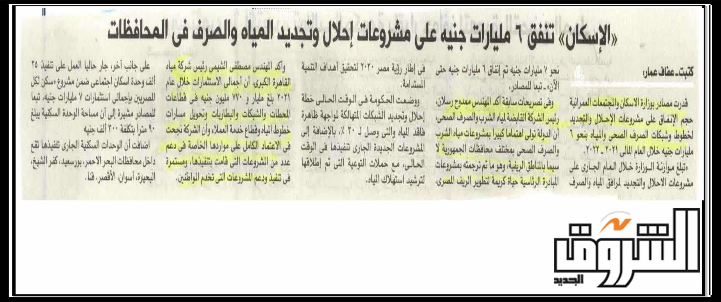 الاسكان: تنفق 6 مليارات جنية على مشروعات إحلال وتجديد المياه والصرف في المحافظات .