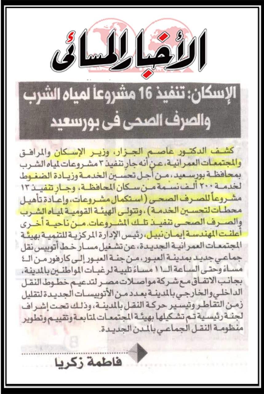 الاسكان: تنفيذ 16 مشروعا لمياه الشرب والصرف الصحي في بور سعيد