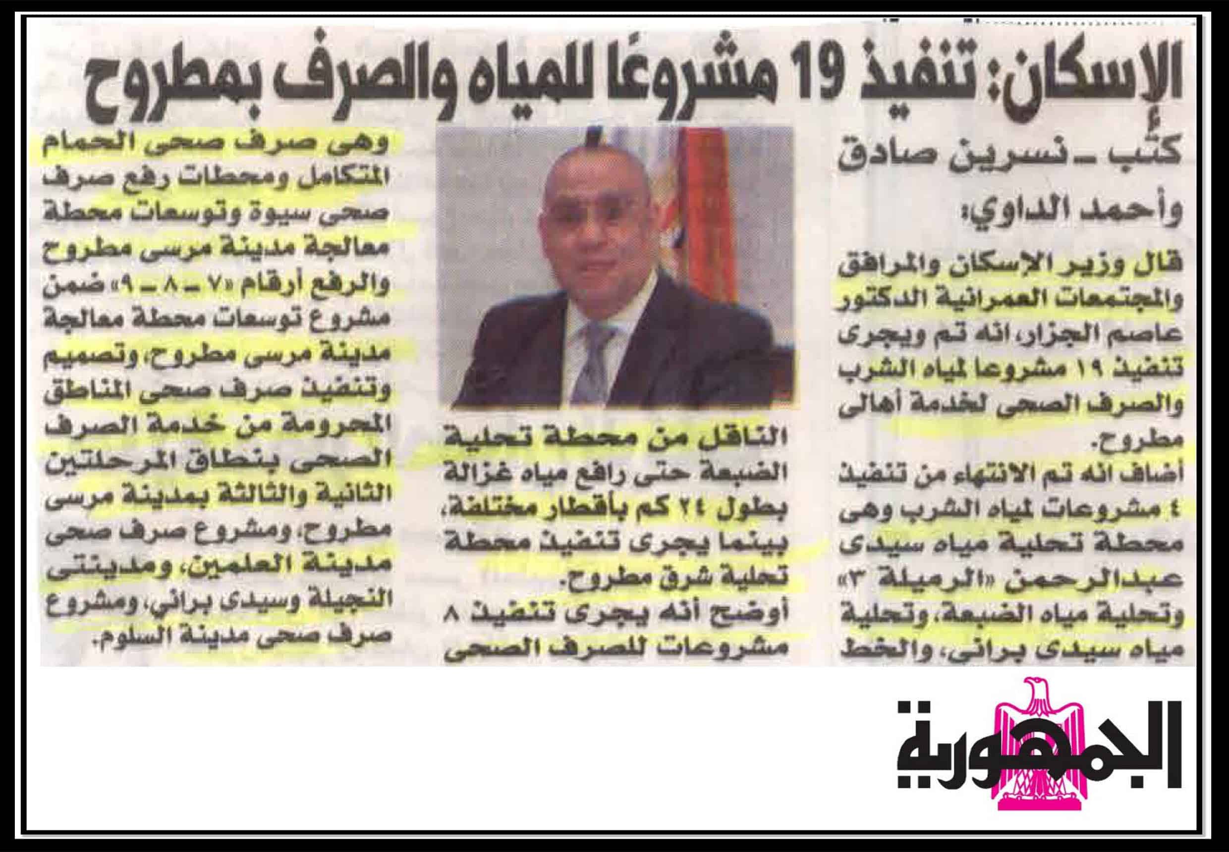 الاسكان : تنفيذ 19 مشروعاً للمياه والصرف بمطروح .