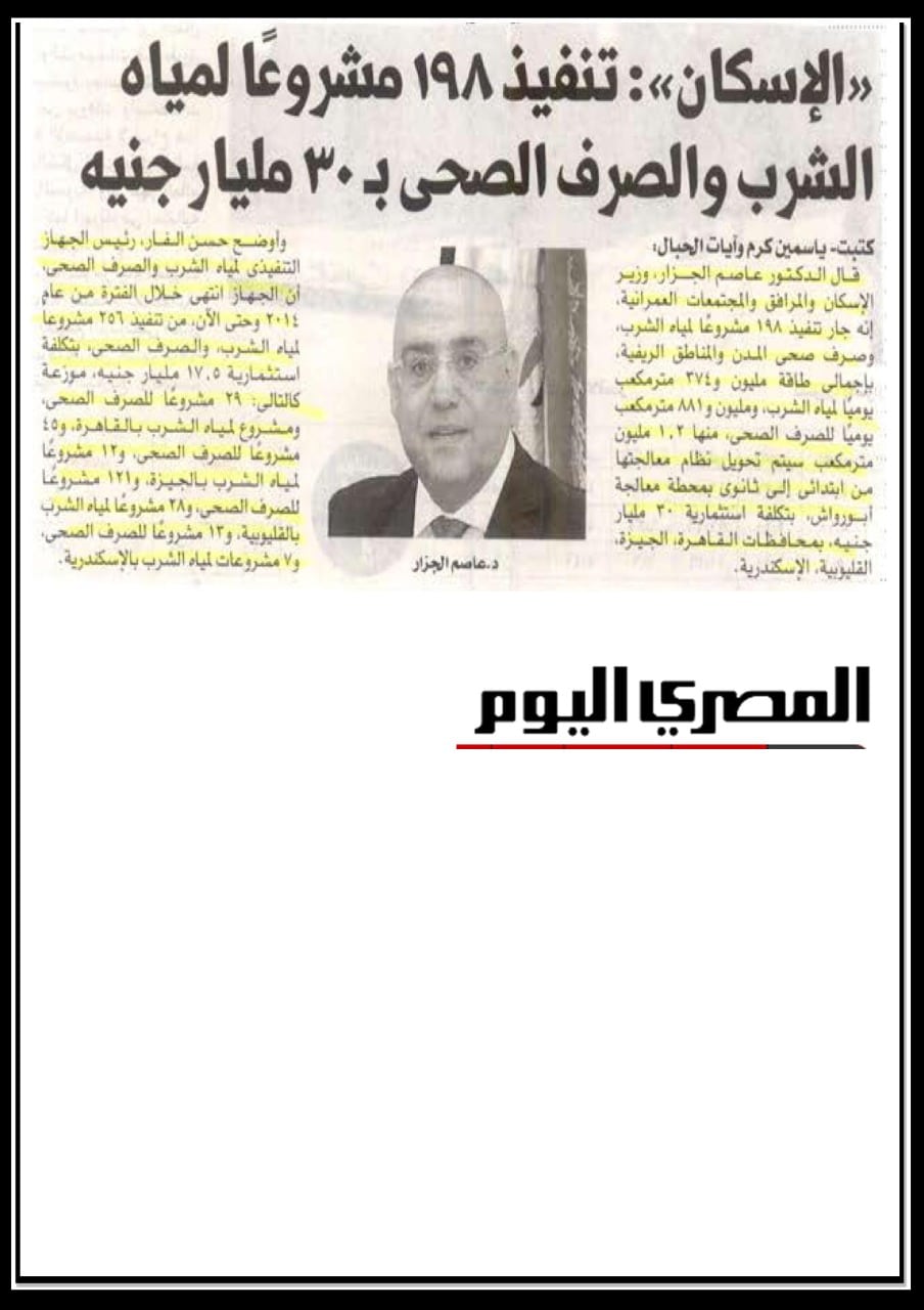 الاسكان: تنفيذ 198 مشروعا لمياه الشرب والصرف الصحي ب 30 مليار جنية
