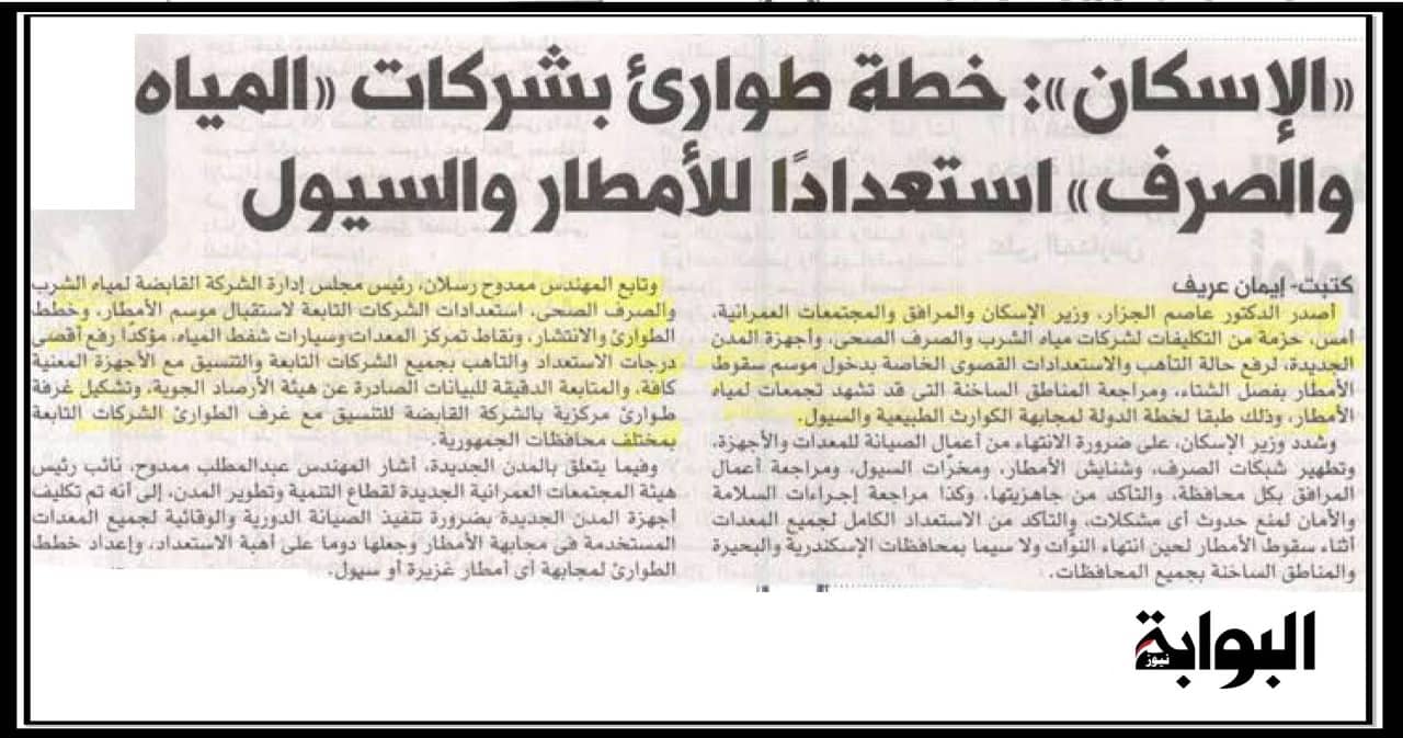الاسكان : خطة طوارئ بشركات المياه والصرف استعدادا للامطار والسيول .