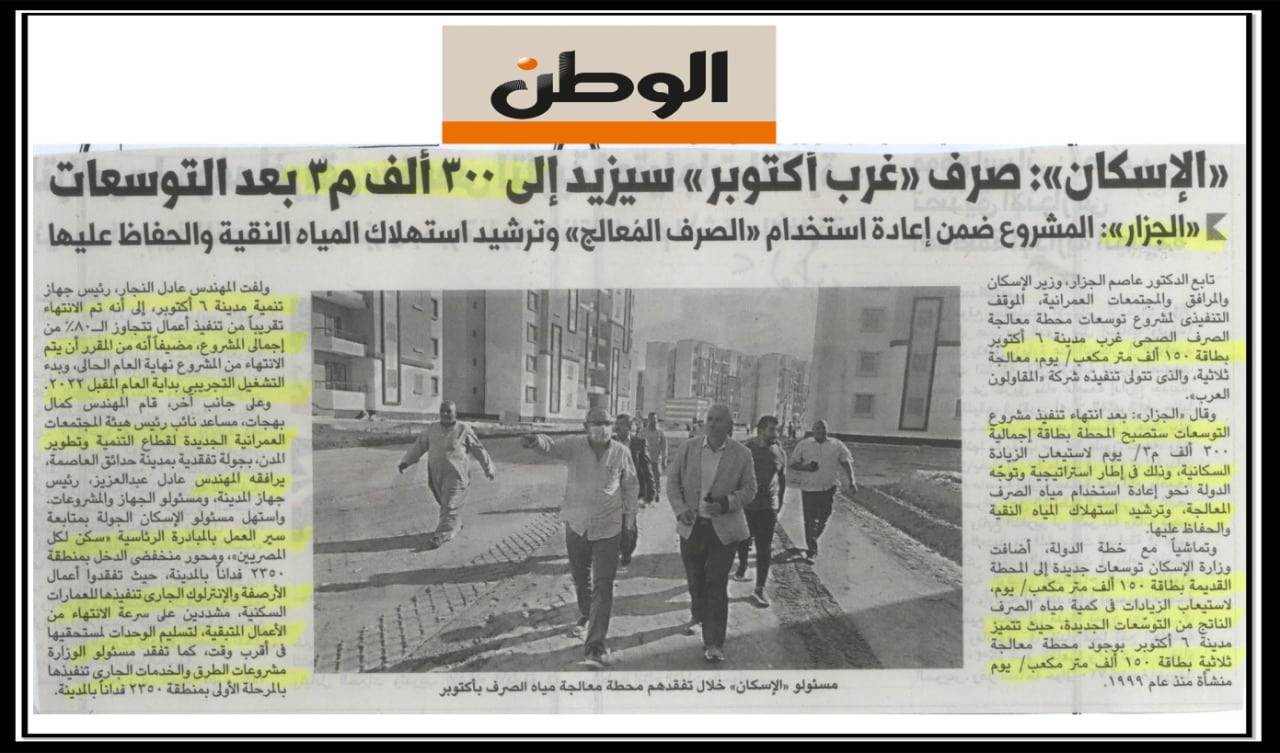 الاسكان: صرف عرب اكتوبر سيزيد الى 300 الف م3 بعد التوسعات