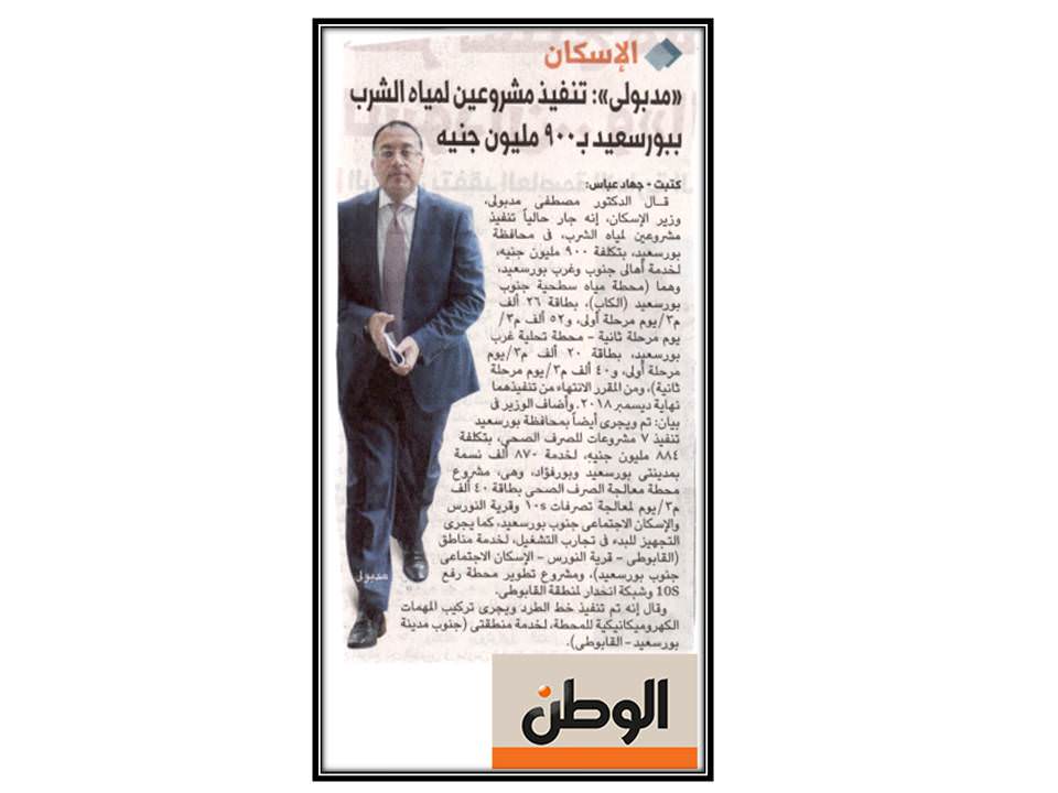 الاسكان : مدبولي … تنفيذ مشروعين لمياه الشرب ببور سعيد بــ 900 مليون جنية .