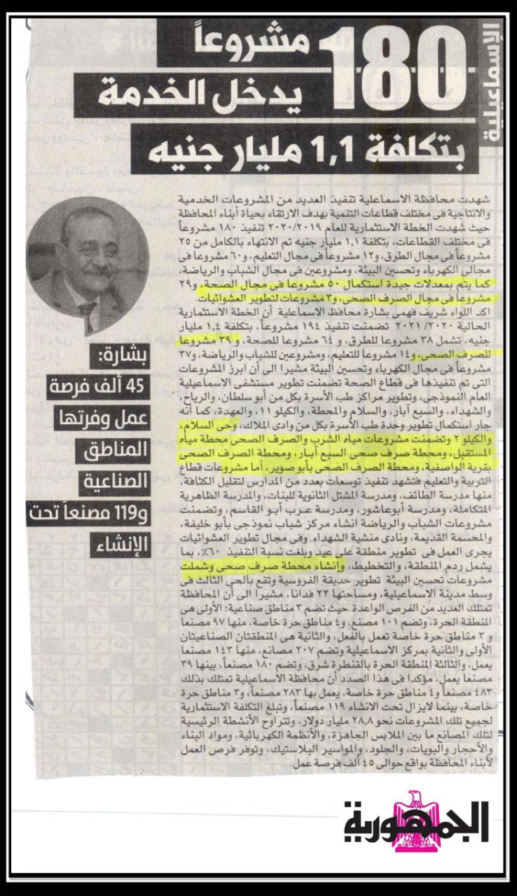 الاسماعيلية : 180 مشروعا يدخل الخدمة بتكلفة 1.1 مليار جنية .