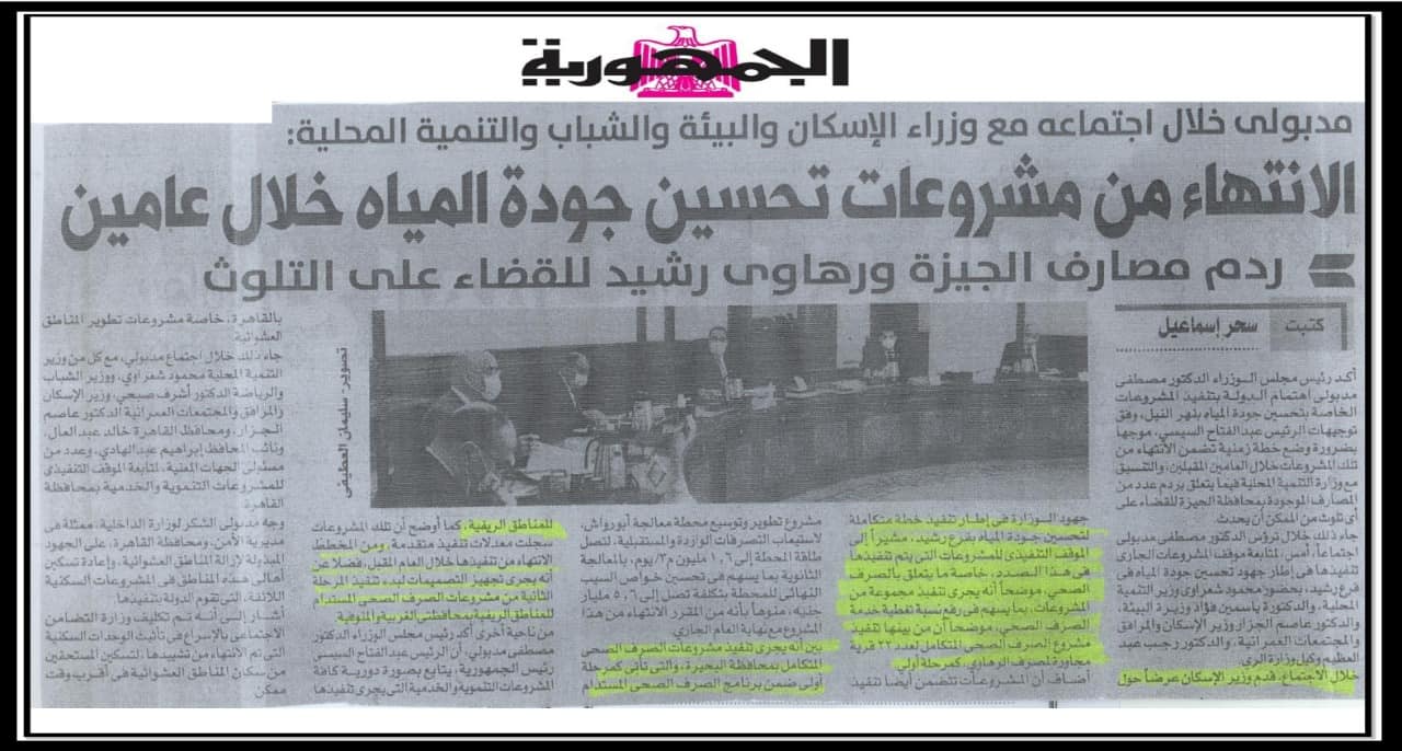 الانتهاء من مشروعات تحسين جودة المياه خلال عامين .
