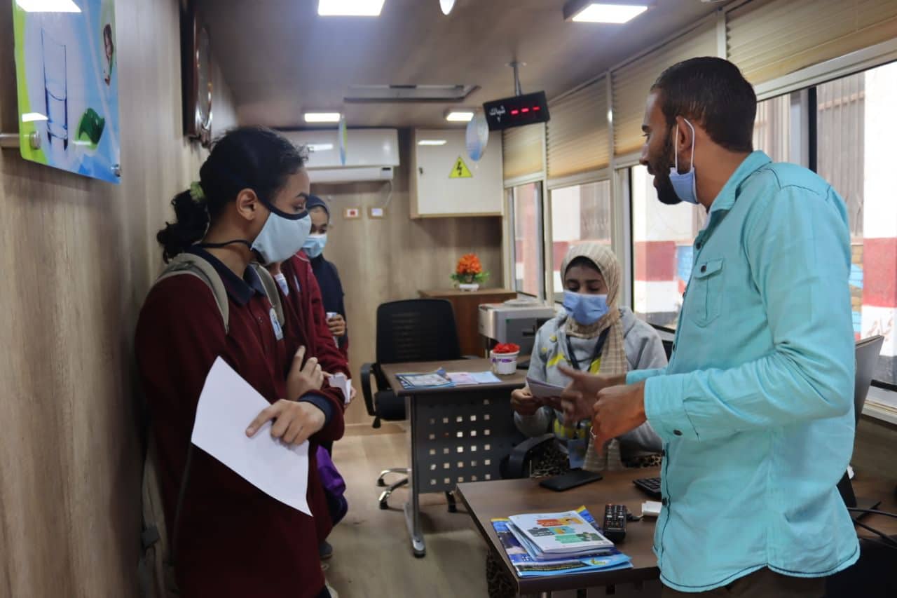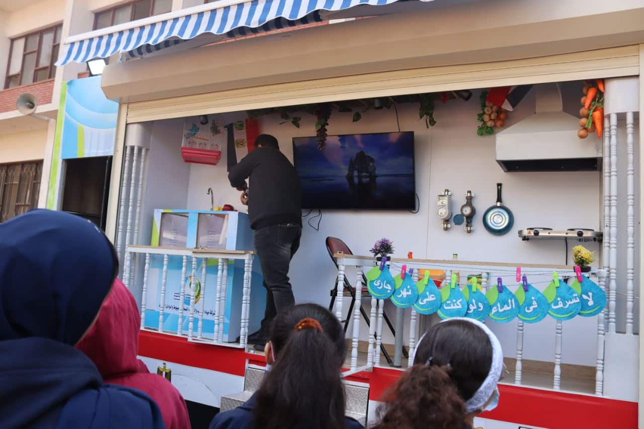 واستخدم فريق التوعية سيارة خدمة العملاء المتنقلة لنشر رسائل التوعية وبرامج المحاكاة وكيفية تركيب القطع الموفرة كأحدى الوسائل لترشيد استهلاك المياه، وتعليمهم كيفية صناعة الصابون من الزيوت المستعملة كأداة لحسن استخدام شبكات الصرف الصحى بالاضافة الى تعليمهم كيفية شحن العدادات فضلا عن امكانية تقديم اى خدمات تخص مسئولي المدرسة من خلال المركز الداخلى للسيارة.