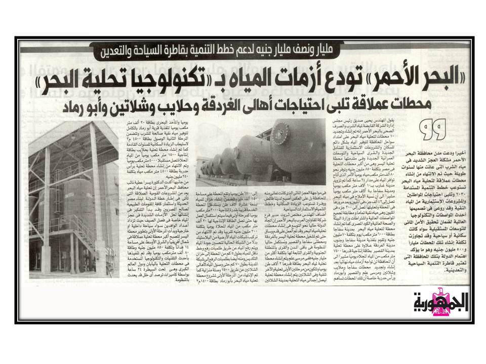 البحر الاحمر تودع أزمات المياه بــ ” تكنولوجيا تحلية البحر ” محطات عملاقة تلبي احتياجات أهالي الغردقة وحلايب وشلاتين وأبو رماد .