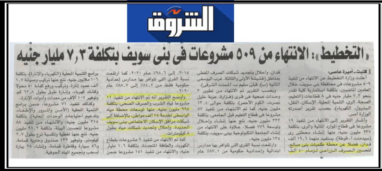 التخطيط: “الإنتهاء من ٥٠٩ مشروعات في بني سويف بتكلفة ٧.٣ مليار جنية