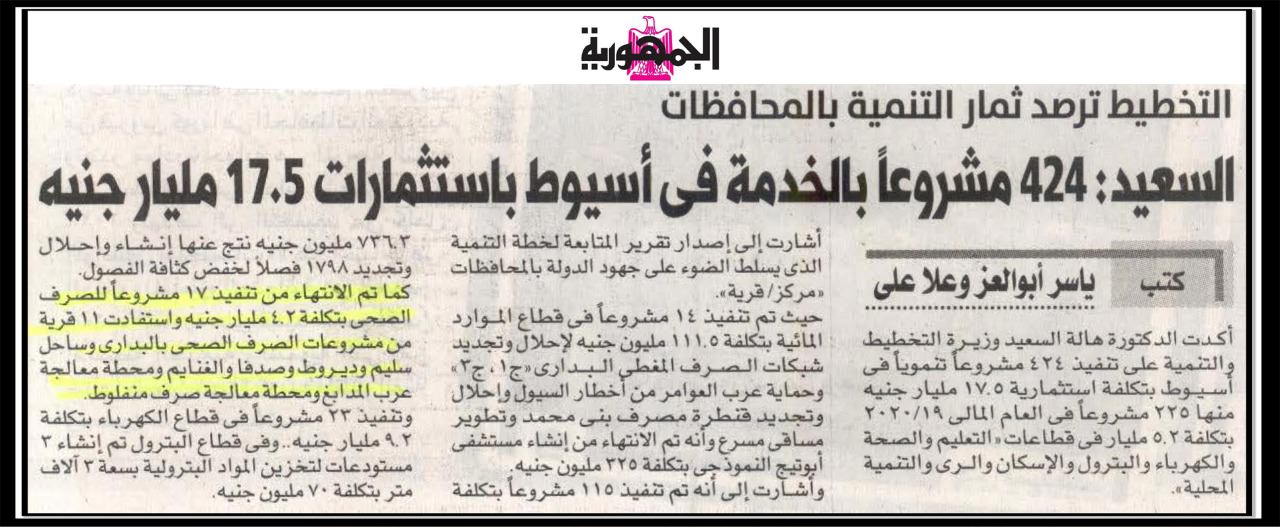 التخطيط: 424 مشروعا بالخدمة في أسيوط باستثمارات 17.5 مليار جنية .