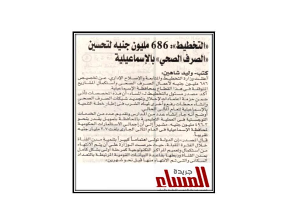 التخطيط : 686 مليون جنية لتحسين الصرف الصحي بالاسماعيلية .