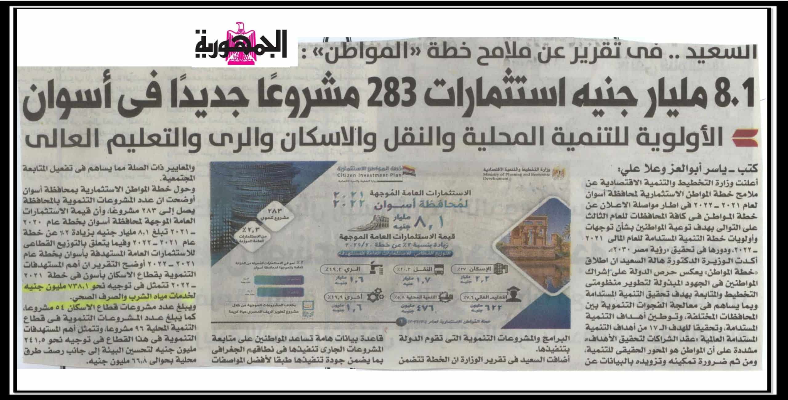 التخطيط: 8.1 مليار جنية استثمارات 283 مشروعا جديد في أسوان .