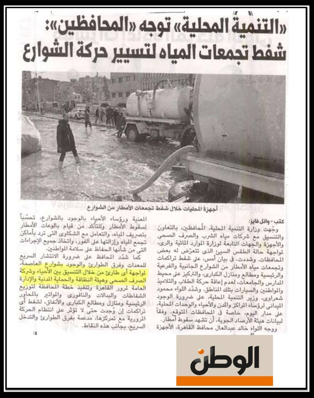 التنمية المحلية .. توجه المحافظين ..شفط تجمعات المياه لتسيير حركة الشوارع .