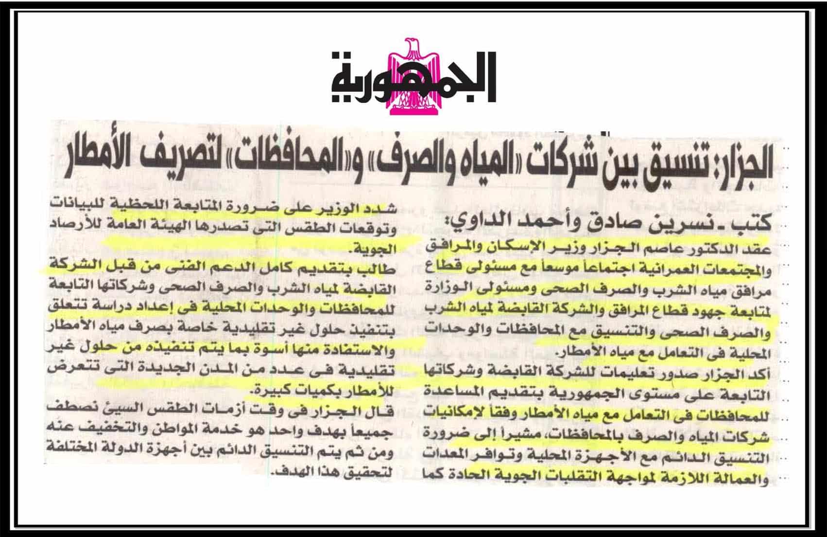 الجزار: التنسيق بين شركات المياه والصرف والمحافظات لتصريف الامطار