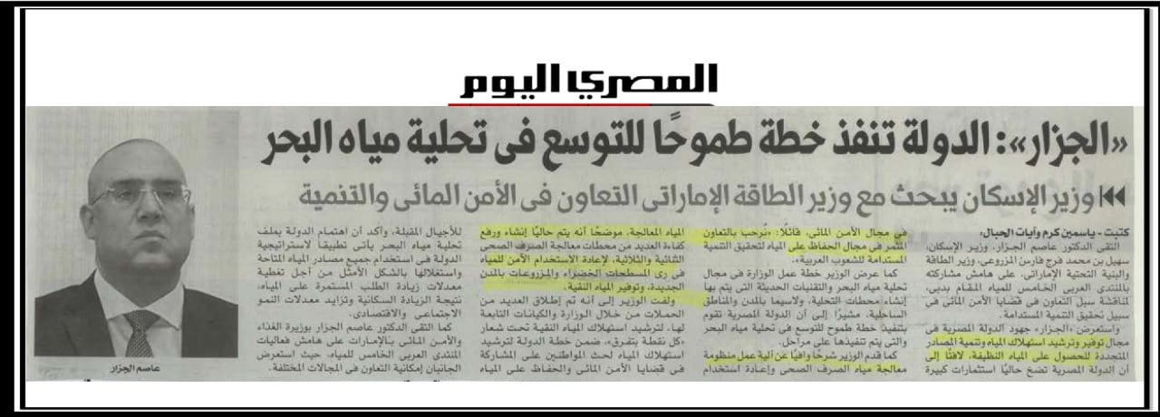الجزار: الدولة تنفذ خطة طموحا للتوسع في تحلية مياه البحر