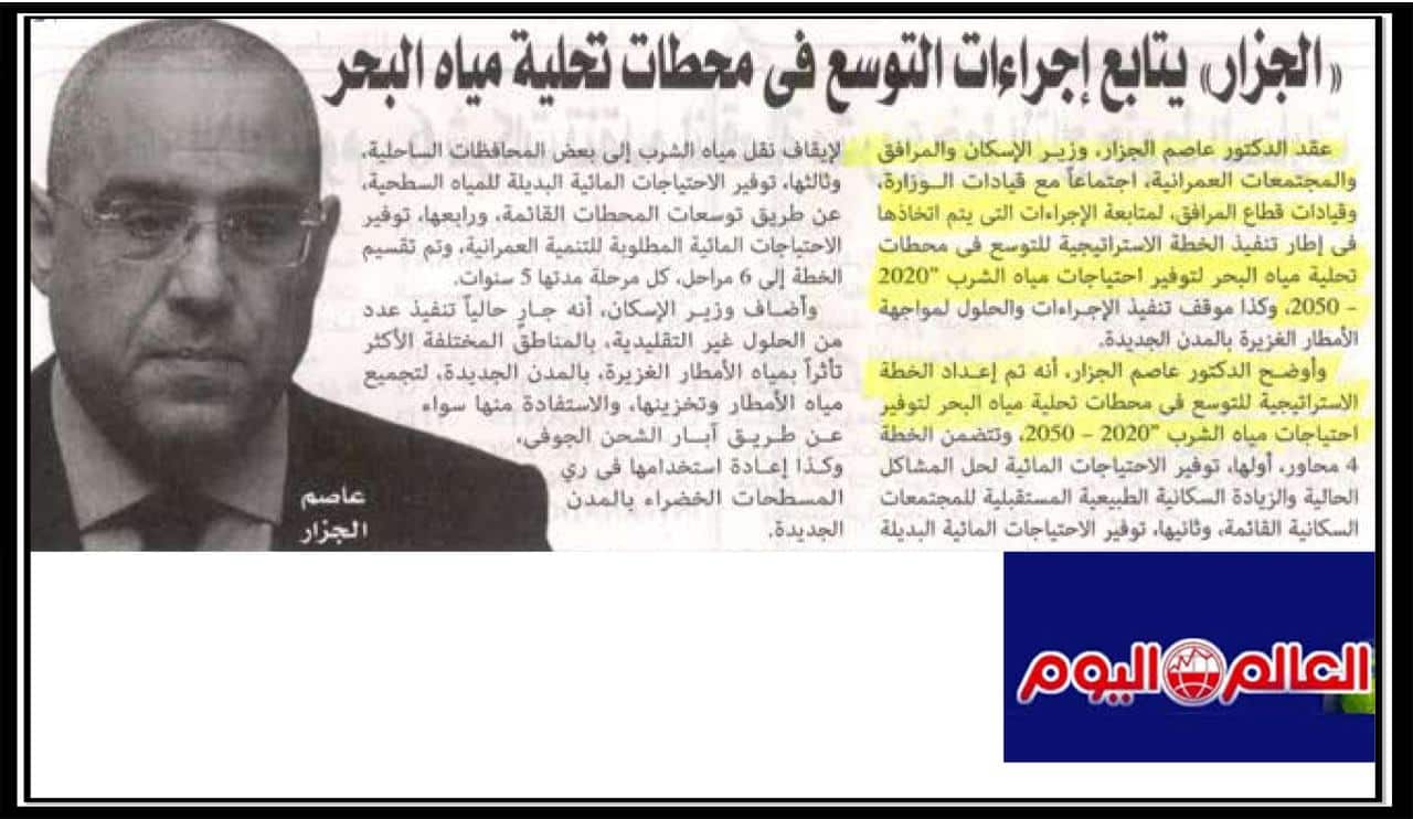 الجزار يتابع اجراءات التوسع في محطات تحلية مياه البحر .