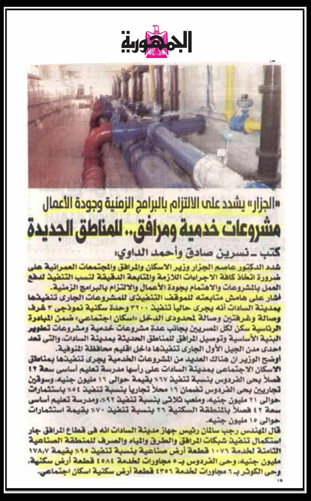 الجزار يشدد علي الالتزام بالبرامج الزمنية وجودة الاعمال مشروعات خدمية ومرافق للمناق الجديدة .