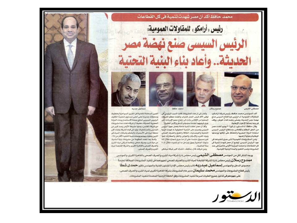 الرئيس السيسي صنع نهضة مصر الحديثة .. ووجة الشكر لكل من رئيس مجلس إدارة الشركة القابضة لمياه الشرب والصرف الصحي والسيد رئيس مجلس إدارة شركة مياه الشرب بالقاهرة لجهودهم في تنفيذ المشروعات العملاقة لخدمة محدودي الدخل .