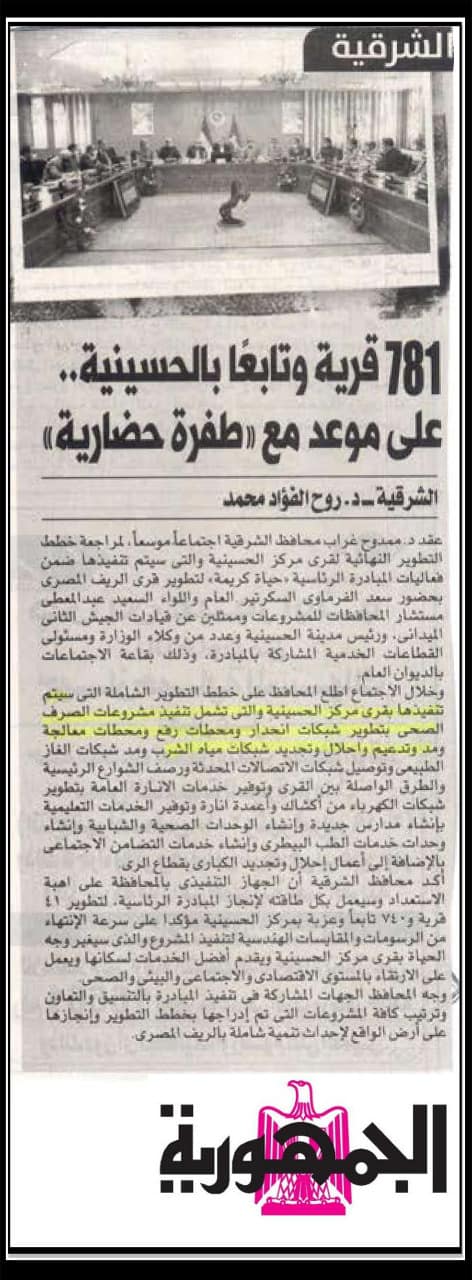 الشرقية: 181 قرية وتابعا بالحسينية على موعد ” طفرة حضارية “