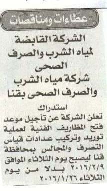 الشركة القابضة لمياه الشرب والصرف الصحي بقنا … 25-1-2016 جريدة الأخبار 25/01/2016| Related Posts مناقصة عامة: شركة مياه الشرب والصرف الصحي بالأقصر 01/04/2026 مناقصة عامة: شركة مياه الشرب والصرف الصحي بأسيوط والوادى الجديد 31/03/2026 مناقصة عامة: شركة مياه الشرب والصرف الصحي بمحافظات القناة 31/03/2026 مناقصة عامة: شركة مياه الشرب بالإسكندرية 29/03/2026 مناقصة عامة: شركة مياه الشرب والصرف الصحي بالأقصر 27/03/2026 مناقصة عامة: شركة مياه الشرب والصرف الصحى بمطروح 12/01/2026 مناقصة عامة: شركة مياه الشرب والصرف الصحى بكفر الشيخ 01/01/2026 مناقصة عامة: شركة مياه الشرب والصرف الصحى بمحافظات القناة 01/01/2026