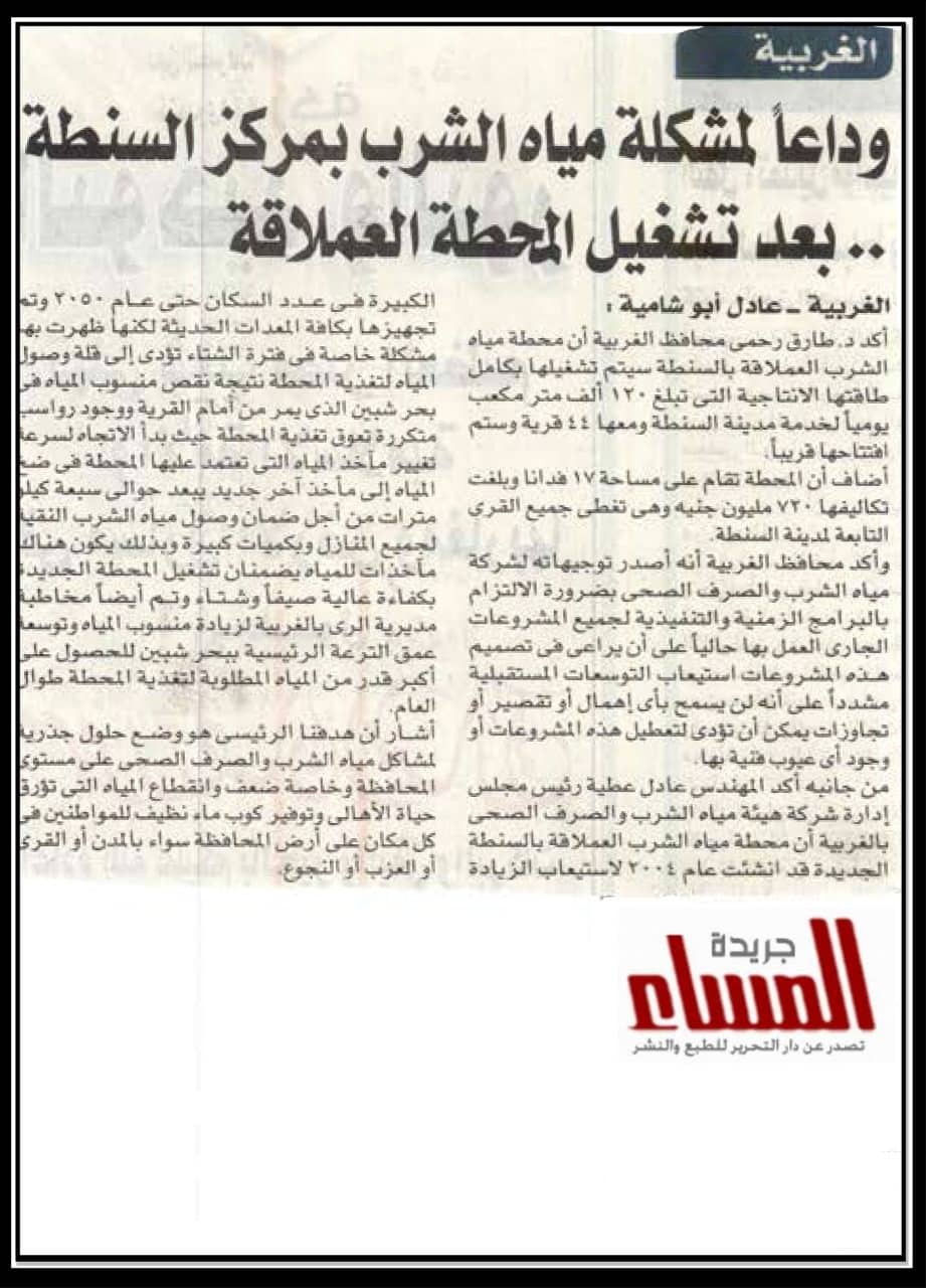 الغربية : وداعا لمشكلة مياه الشرب بمركز السنطة …بعد تشغيل المحطة العملاقة .