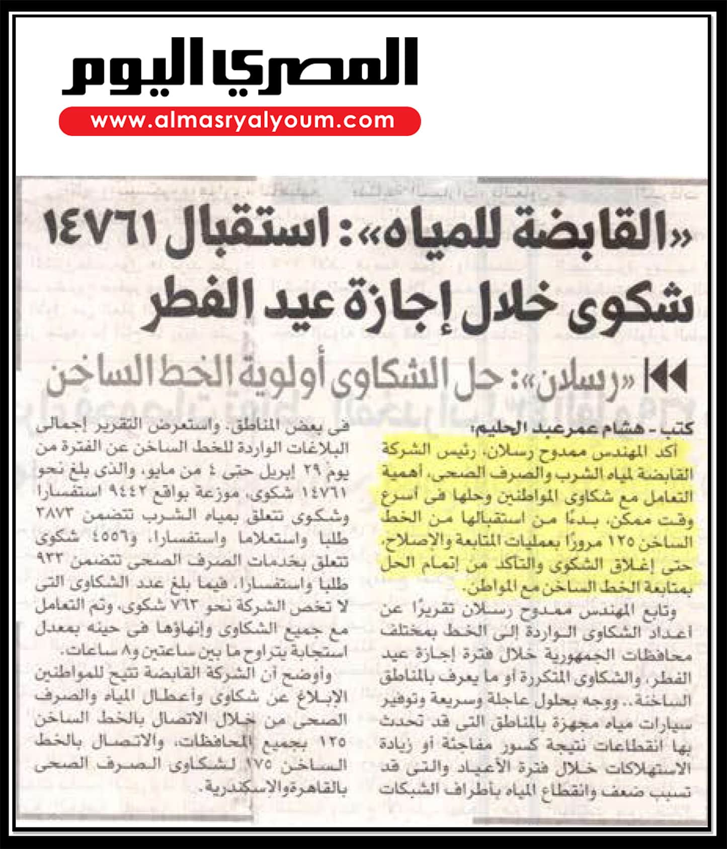 القابضة للمياه : استقبال 14761 شكوي خلال إجازة عيد الفطر.