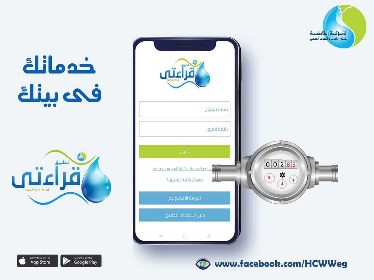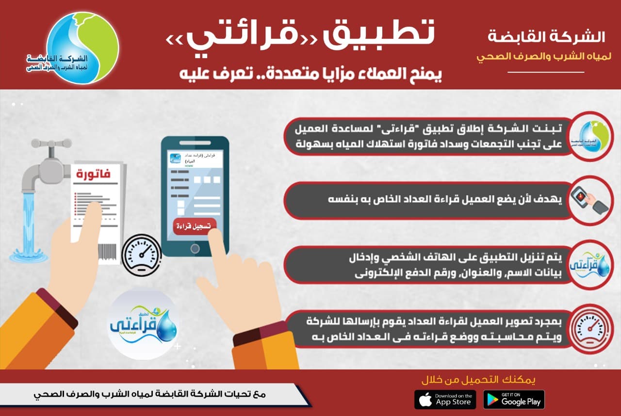 دعت الشركة القابضة لمياه الشرب والصرف الصحي عبر صفحتها الرسمية على موقع الفيسبوك https://facebook.com/HCWWeg، المواطنين لتسجيل قراءة عداد المياه، فى الفترة من يوم ١ إلى ١٥ من كل شهر، من خلال تطبيق الهاتف المحمول قراءتى.