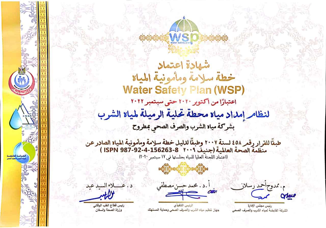فيما أعلن الدكتور مهندس ابراهيم خالد رئيس شركة مياه الشرب والصرف الصحى بمطروح، عن حصول محطة الرميلة لتحلية مياه الشرب غرب مرسى مطروح، شهادة اعتماد سلامة ومأمونية المياه.
