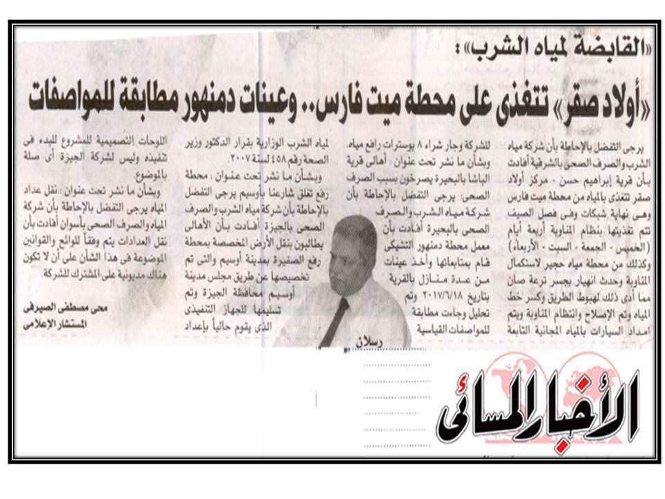 القابضة لمياه الشرب: اولاد صقر تتغذى على محطة ميت فارس …وعينات دمنهور مطابقة للمواصفات