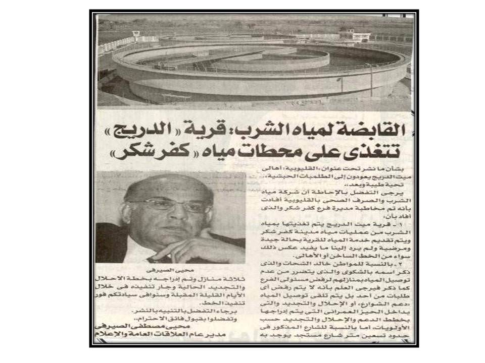 القابضة لمياه الشرب :قرية ( الدريج )تتغذى على محطات مياه (كفر شكر )….2016/2/25