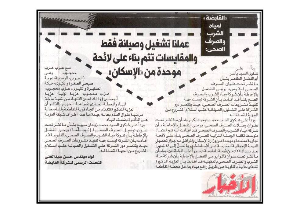 القابضة لمياه الشرب والصرف الصحي : عملنا تشغيل وصيانه فقط ..والمقايسات تتم بناء على لائحة موحدة من الاسكان .