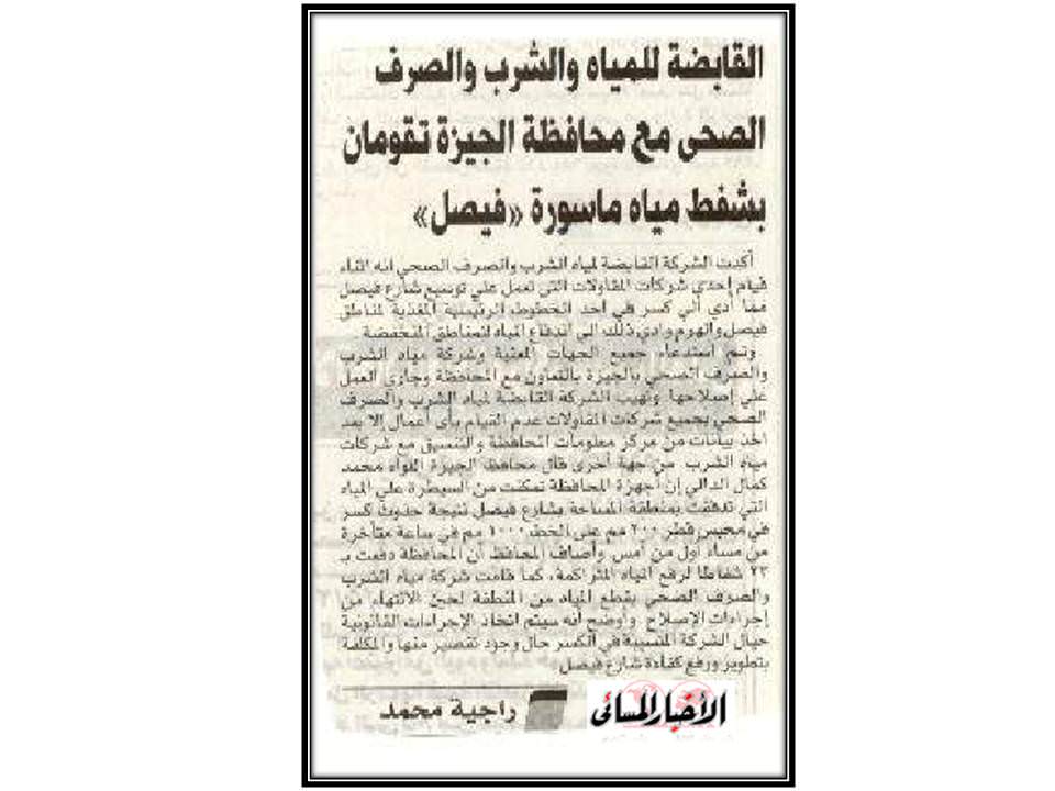 القابضة لمياه الشرب والصرف الصحي مع محافظة الجيزة تقومان بشفط مياه ماسورة (فيصل ) ….2016/5/7