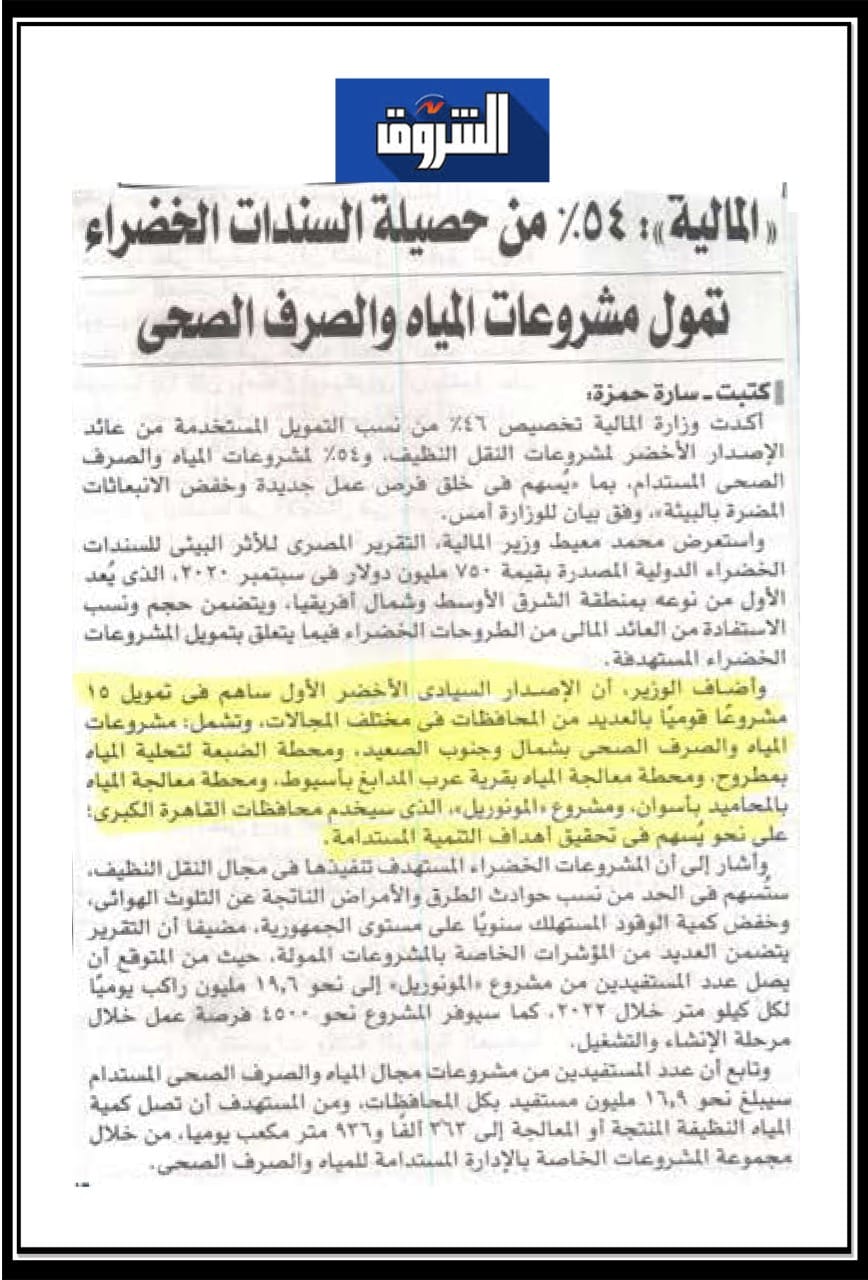 المالية: 54% من حصيلة السندات الخضراء تمول مشروعات المياه والصرف الصحي