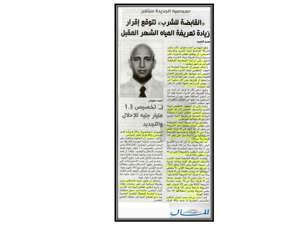 المحاسبة الجديدة سبتمبر : القابضة للشرب تتوقع إقرار زيادة تعريفة المياه الشهر المقبل …..2017/6/8